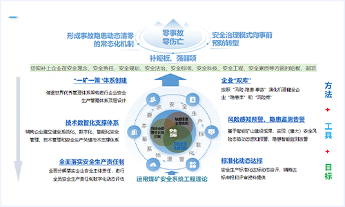 煤礦安全生產(chǎn)保障支撐體系是充分研究借鑒國(guó)際通用的安全管理體系架構(gòu),以國(guó)家法律法規(guī)、技術(shù)標(biāo)準(zhǔn)為基礎(chǔ),運(yùn)用煤礦安全系統(tǒng)工程理論,構(gòu)建以安全目標(biāo)為引領(lǐng),風(fēng)險(xiǎn)分級(jí)管控、隱患排查治理和風(fēng)險(xiǎn)防范化解三大機(jī)制構(gòu)建為核心,以安全生產(chǎn)標(biāo)準(zhǔn)化管理體系基本要求為主線,通過(guò)體系、雙庫(kù)建設(shè)的方式方法,借助安全、技術(shù)等數(shù)智化保障支撐工具,實(shí)現(xiàn)安全生產(chǎn)責(zé)任制全面落實(shí)、標(biāo)準(zhǔn)化動(dòng)態(tài)達(dá)標(biāo)的目標(biāo)。切實(shí)補(bǔ)上煤礦在安全管理方面的短板、弱項(xiàng),最終實(shí)現(xiàn)“零事故、零傷亡”的宏偉目標(biāo)。